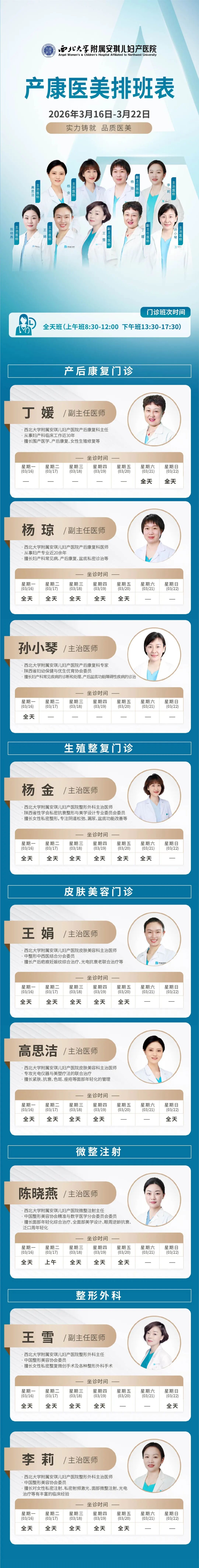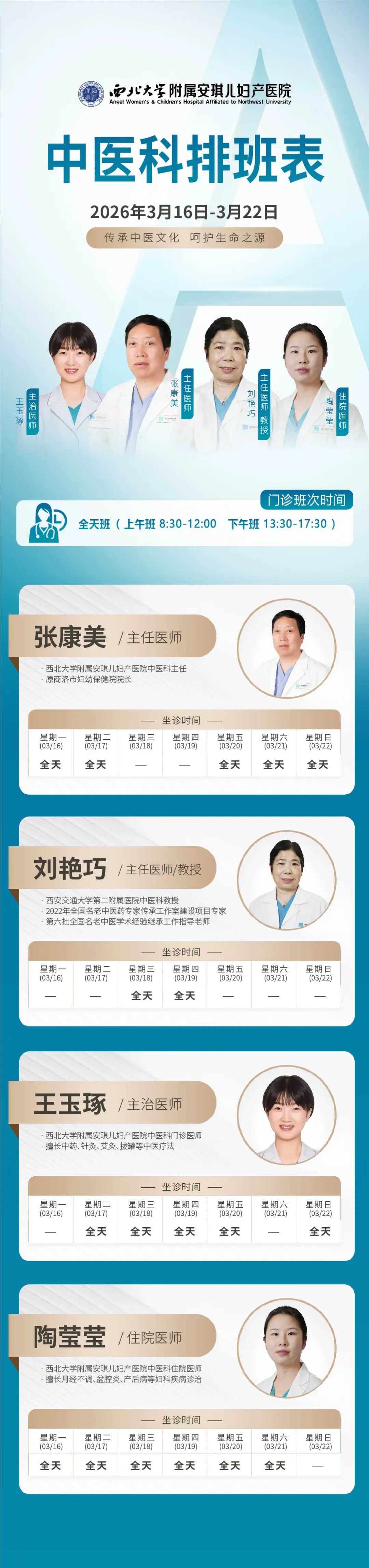 西安安琪儿妇产医院(3月16日至3月22日)专家坐诊时间表